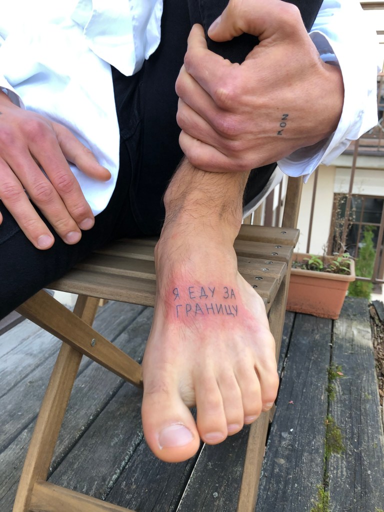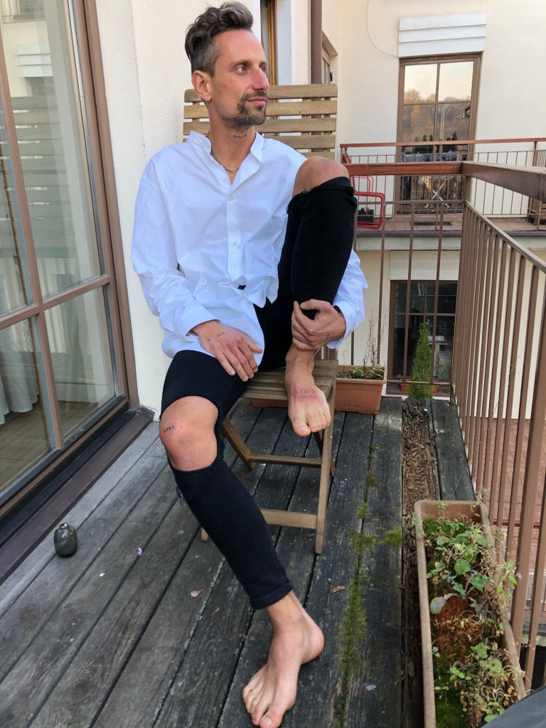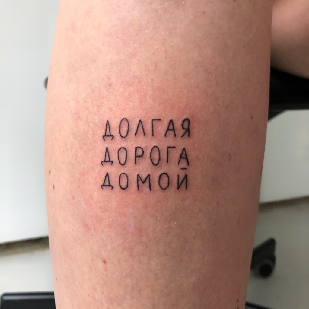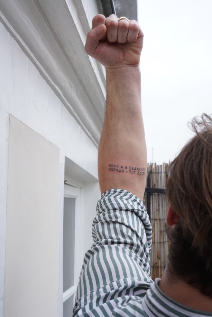 ‘Couldn’t you wait for me?’ I asked staring at his tattoo. ‘I really needed it at that time! I went to the best tattoo parlor in Vilnius and asked for a handpoke, just one word. I had spent an hour with the tattoo master trying to copy your handwriting and then he said that he was unable to do it handpoke, so we did it by gun,’ he laughed.