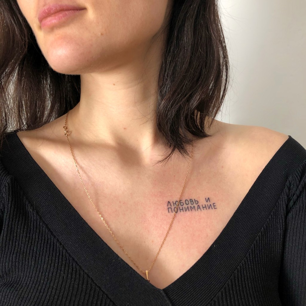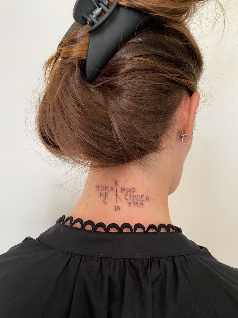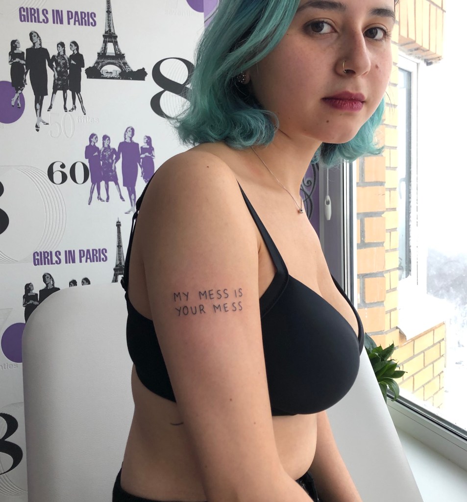 ‘What have you done?’ I asked. ‘I failed my exams, and I was excluded, three times.’ Saying this, she hid her eyes. ‘In what language do you study?’ ’In Russian, of course!’ ‘Так ты говоришь по-русски?’ I asked in Russian. ’I do know Russian!’ Farah said, as if it was something ordinary. ‘But I find it easier to communicate in English. Reading your posts, I noticed that you know English and I was very happy that here in Moscow I could finally speak English with someone.’ Making this statement, she proffered her wide smile. ‘What caused you to fail the exams?’ ’I don’t know. I was depressed, the exams were very hard, and I never actually loved what I was doing’. ‘Why did you choose to study medicine in Moscow?’ ’My mum decided for me. She wanted me to become a doctor because it is a respectable job in Tunisia. Since she met my father, she dreamed to be a doctor, so, by default, she wanted all her six children to fulfill her dream.’ ‘I understand. But why Moscow?’ ’My high school grades were not good enough to allow me to study medicine in Tunisia, so my parents offered me the opportunity to study in Moscow.’ While talking about it, Farah kept smiling. ‘I agreed because I wanted to leave Tunisia.’ After this I had fallen into thoughts about Farah and her parents. Her story, of a child who suffered from unaccomplished dreams of her frustrated parents, sounded familiar to me. One way or another, we all face a similar pressure. According to western liberal opinion, young people like Farah firstly need time to understand what is going on, to experience different ways of living, to fall in love, to destroy something, maybe later to find the meaning of life and then choose a profession. ‘How do your parents feel about your exclusion from the university?’ ’They don’t know about it. When my mum will find out, she will kill me!’ Of course, she won’t kill her, but I understood that it could be a big drama. ‘How do you think your mother will react when she sees the tattoo?’ I decided to focus on her mother and make the tattoo around it. ’She won’t forgive me that.’ Farah said with confidence. ‘Why then do you want it?’ ’I like tattoos and I like your works, especially I like the idea of your project. I couldn’t miss that opportunity.’ I went through my notes, circled the keywords from the interview. Having done so, I decided to write a message to Farah’s mother: that the mess of her child is caused by her own ineptitude.