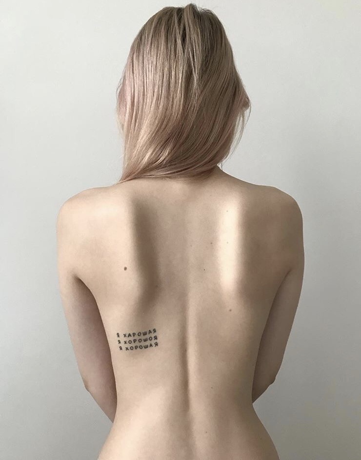 The tattoo is translated from Russian as, “He who is happy in poverty is truly rich.”