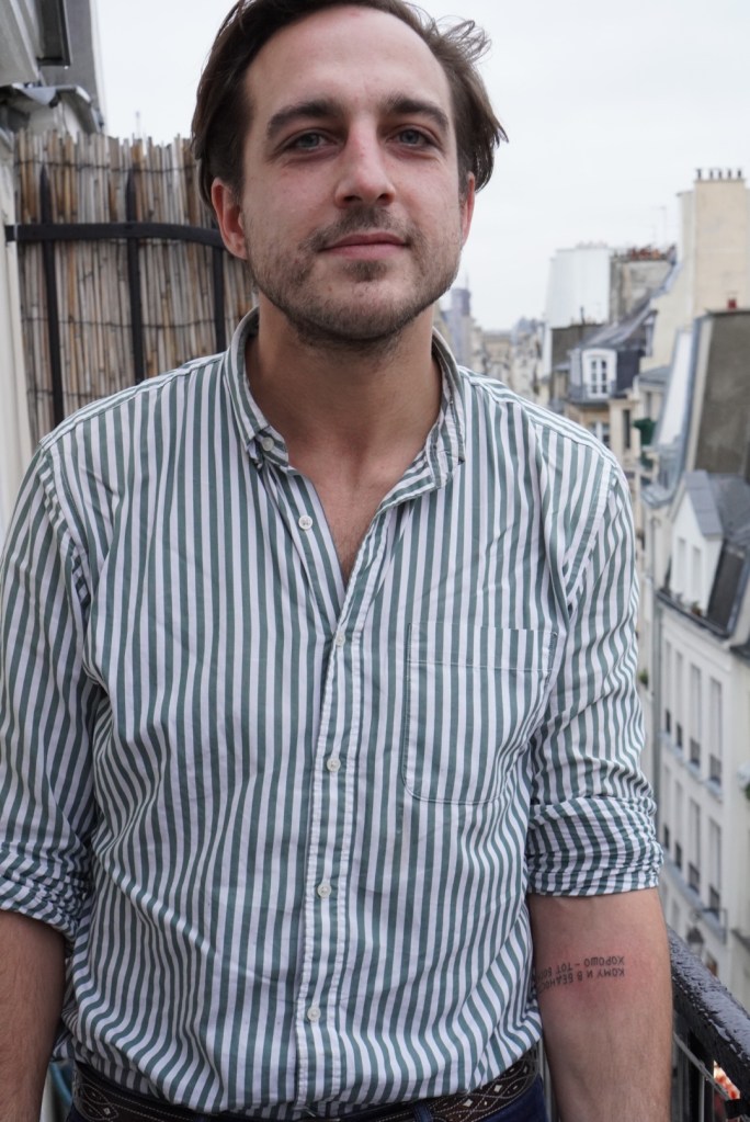It was Paris, December 2020. Adrien was a stranger, arriving at my studio for his first tattoo, pulling two travel cases behind him. He took off his brown coat. “Like I told you on Instagram, my train leaves Gare de Lyon in four hours.” I watched him. “We’ll make it. Where are you going?” He hung his coat on the wooden rack. “Home. A village called Condillac.” Tall, dark hair, he had a kind, hexagonal face. His eyes looked tired, his stubble self-assured. He wore a striped shirt beneath a brown corduroy jacket—both unbuttoned—blue skinny jeans, and well-worn leather shoes.